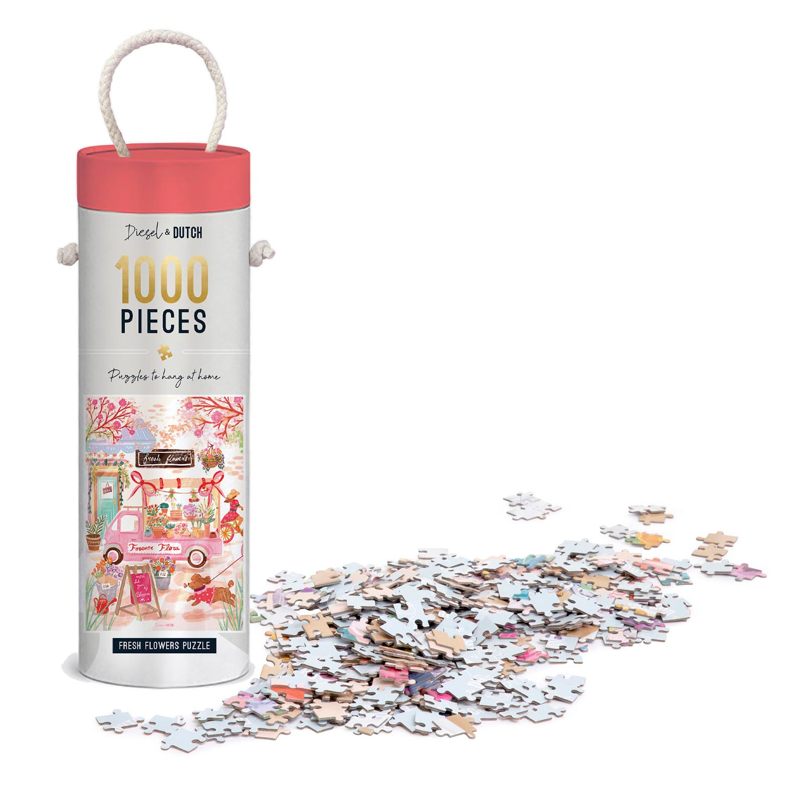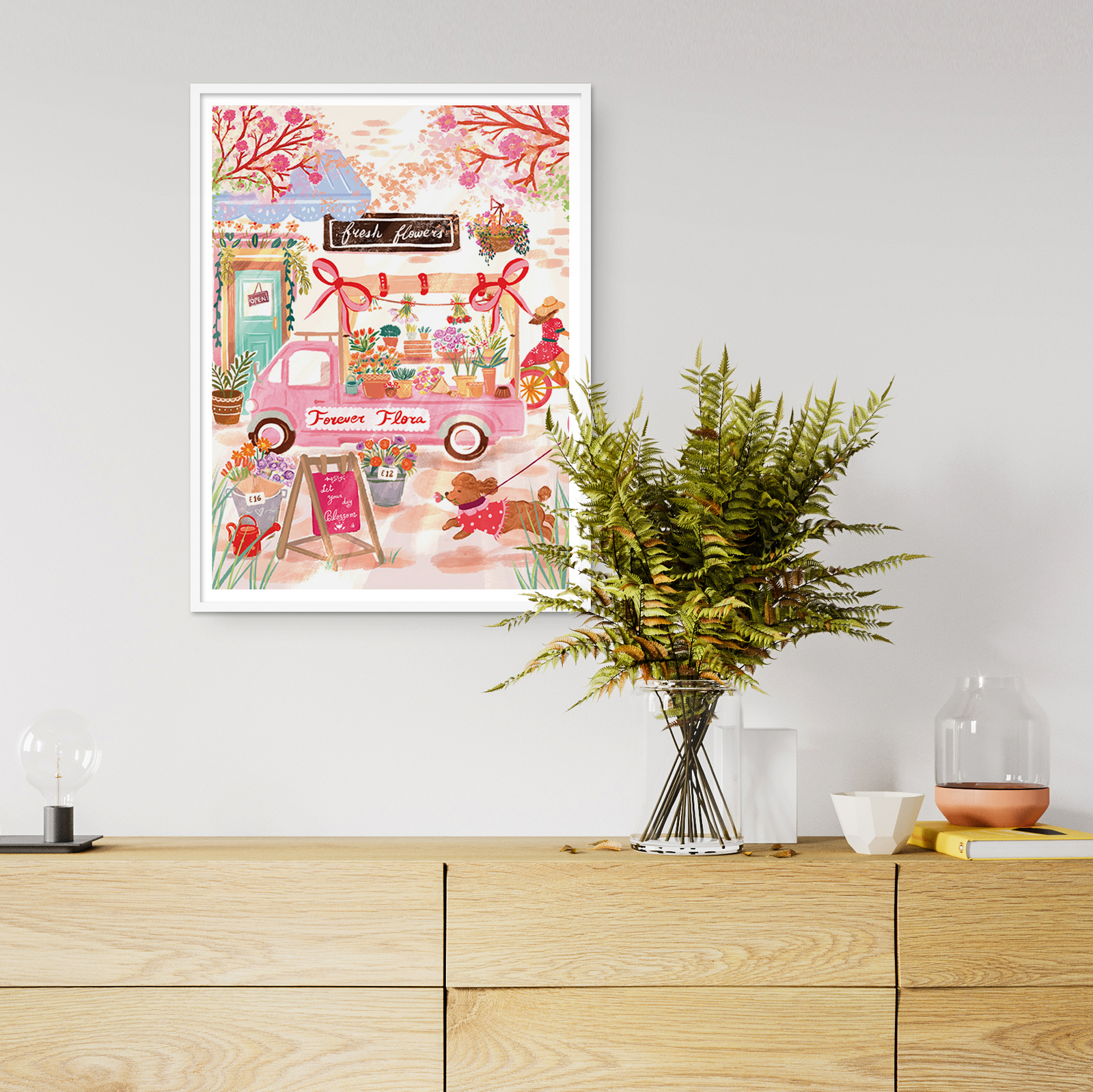 A vintage pink flower truck overflows with vibrant blooms, creating a picturesque market scene full of charm and warmth. Nearby, a playful pup dressed in a polkadot outfit trots along, adding a whimsical touch. Surrounded by blossoming trees and a quaint little shop, this delightful puzzle captures the essence of a bright and cheerful spring day.